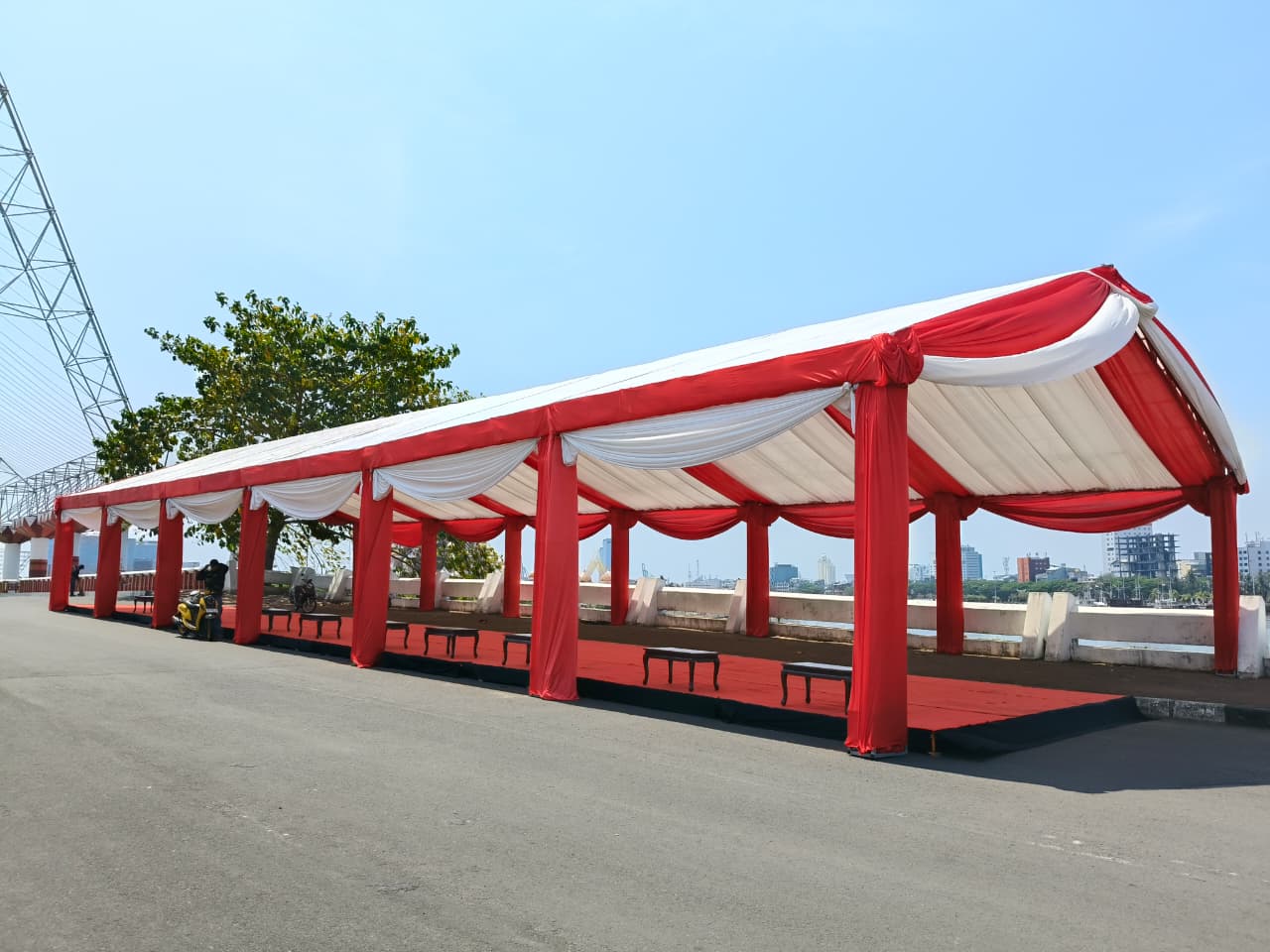 Tenda roder dengan dekorasi kain. Tenda roder adalah tenda besar dengan rangka alumunium dan terpal membran terpaulin PVC putih.Uk 5x20