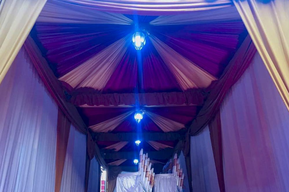 Tenda kerucut sarnafil 3 x 3 m dengan dekorasi sentral (kain ditarik ke tengah dan bagian tengah diberi ornamen bunga atau lampu), umbul juntai, dan pembungkus tiang. Tenda kerucut sarnafil adalah tenda dengan rangka alumunium dan membran sarnafil putih.