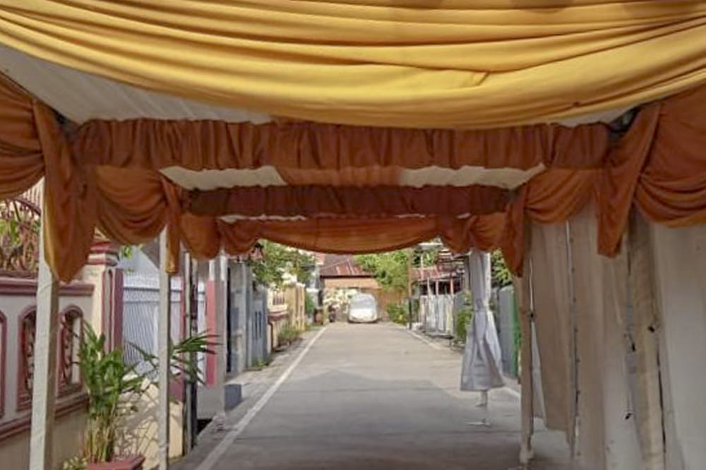 Tenda kerucut sarnafil 3 x 3 m dengan dekorasi plafon, umbul juntai, dan pembungkus tiang. Tenda kerucut sarnafil adalah tenda dengan rangka alumunium dan membran sarnafil putih.