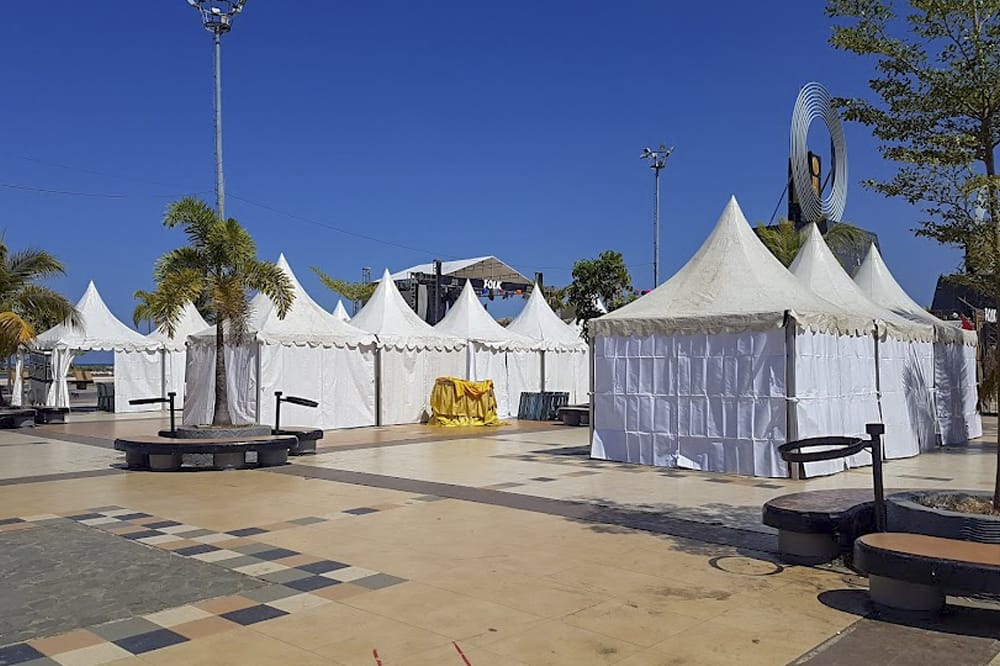 Tenda kerucut sarnafil 3 x 3 m tanpa dekorasi. Tenda kerucut sarnafil adalah tenda dengan rangka alumunium dan membran sarnafil putih.