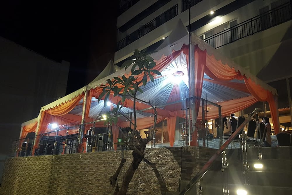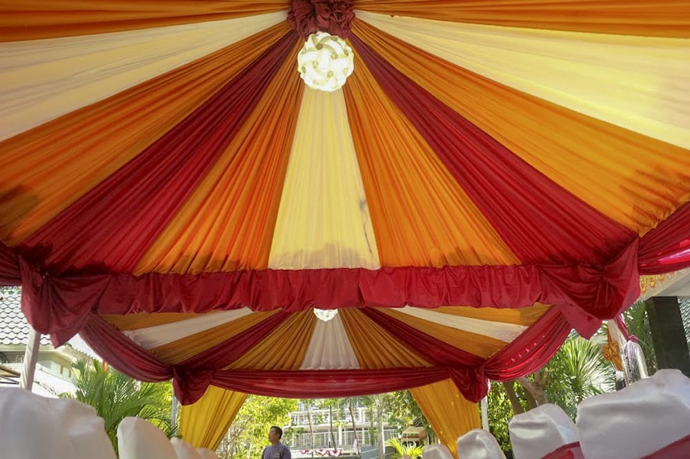 Tenda kerucut sarnafil 5 x 5 m dengan dekorasi sentral (kain ditarik ke tengah dan bagian tengah diberi ornamen bunga atau lampu). Tenda kerucut sarnafil adalah tenda dengan rangka alumunium dan membran sarnafil putih