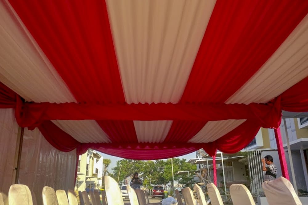 Tenda kerucut sarnafil 5 x 5 m dengan dekorasi plafon.